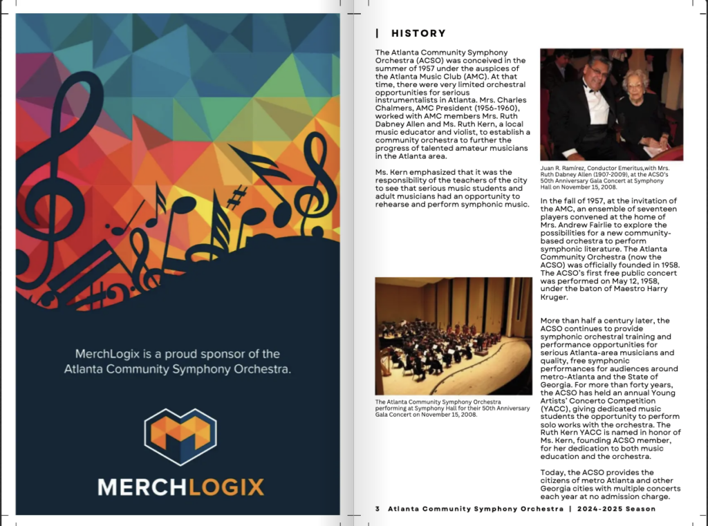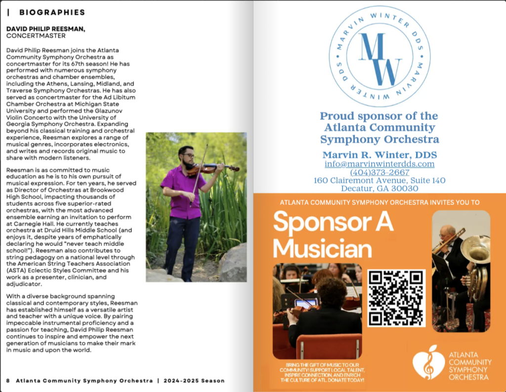 The ACSO distributes concert programs to our audiences. Print advertising allows our sponsors, like you, to share their messages with a larger portion of the greater Atlanta community. We encourage you to please consider purchasing an ad and assisting us with our musical performances and community engagement concerts for the 2025-2026 68th concert season. The ACSO produces professional-quality playbills, in full color, which will be distributed at every concert performance throughout the year.